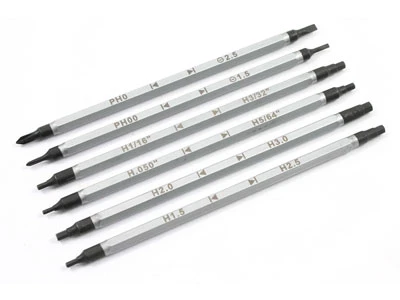- Phillips PH00 and PH0, 1.5mm and 2.5mm flat head screw driver bits.