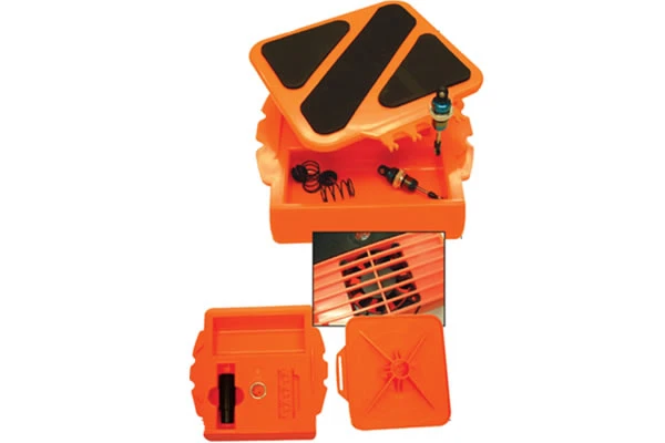 Rotate your car while working to maximum time and pit space. Tray underneath can hold screws and hardware while rotating top can also hold shocks for building.